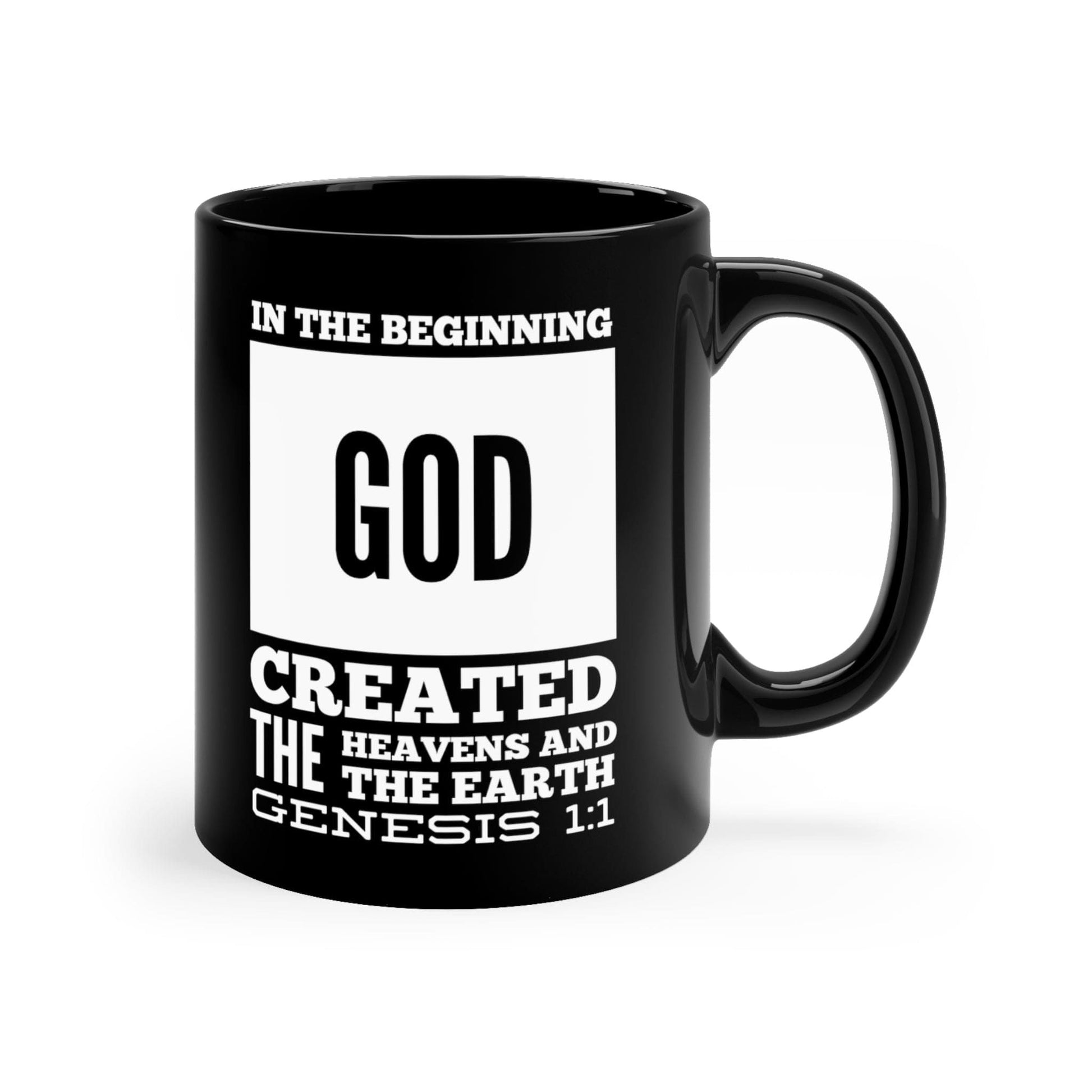 Black Ceramic Mug - 11oz, In The Beginning God Created The Heavens And The Earth Illustration