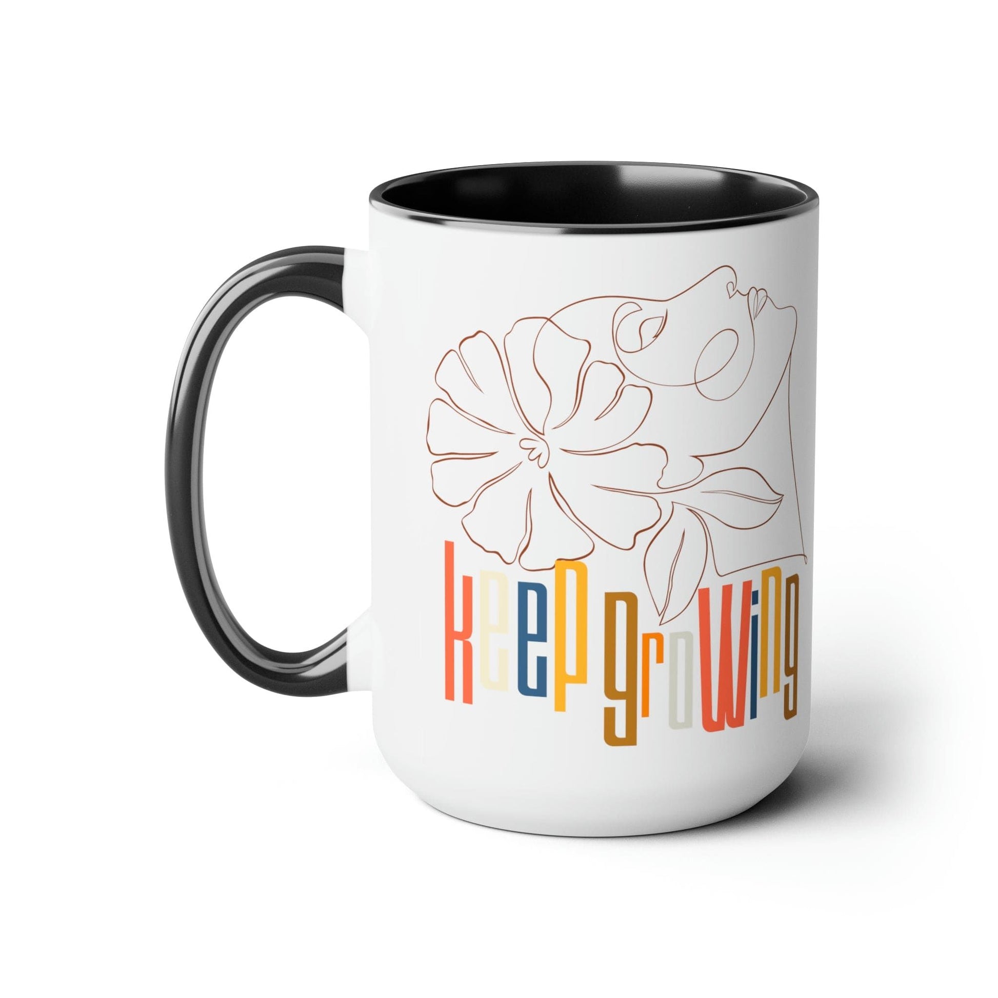 Say It Soul - Keep Growing In Pastel Colors, Spring Inspiration, Floral Line Art, Woman Line Art, Ceramic Coffee Mug. Warm-up with a nice cuppa out of this two-tone accent ceramic coffee mug. This mug is perfect for your morning cup of coffee, tea, hot cocoa, or any other hot beverage. It's also great for cold beverages! The ceramic mug is microwave and dishwasher safe. It's BPA and Lead-free, and made of durable ceramic in 15-ounce size.