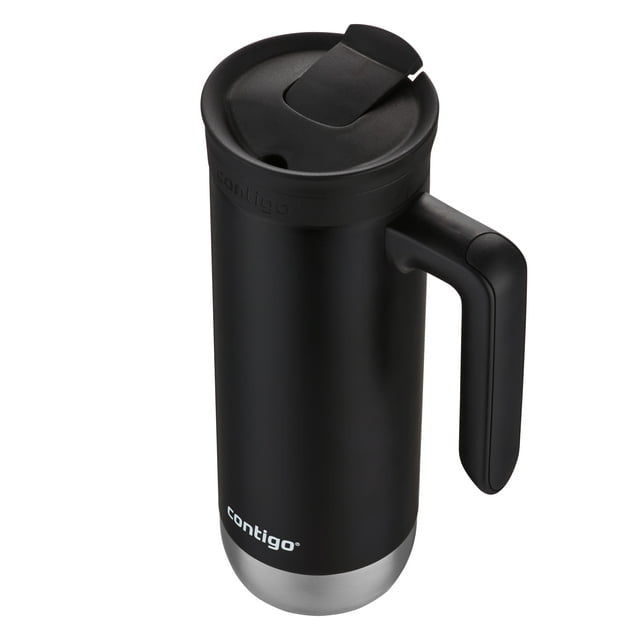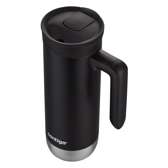The Contigo Huron 2.0 Stainless Steel Travel Mug with SNAPSEAL Lid and Handle Black Licorice, 20 fl oz. keeps drinks hot up to 7 hours or cold up to 18 thanks to THERMALOCK™ double-wall vacuum insulation. The one-piece SNAPSEAL™ lid allows for one-handed drinking with no lids or caps to remove or misplace and is leak-proof when closed. Plus, a carrying handle offers more comfort on the go.