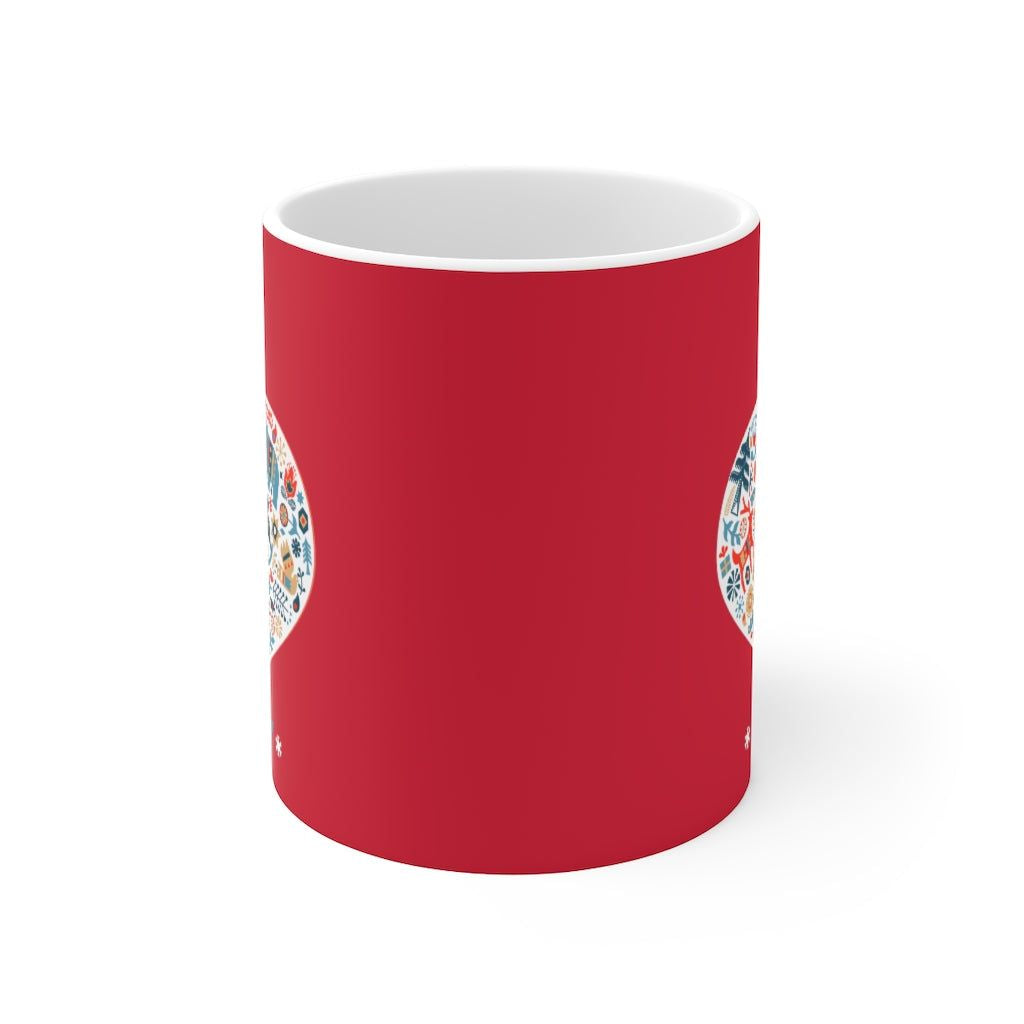 Warm up with a nice cuppa out of this Holiday Ornament with Joy with a red back drop ceramic coffee mug. It's microwave & dishwasher-safe and made of white, durable ceramic in an 11-ounce size. – the perfect gift for the coffee, tea, and chocolate lovers.