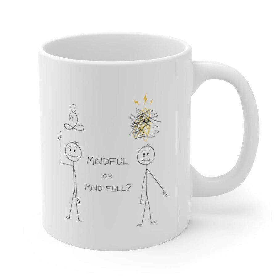 Mindful Stick Figure Humor Mug. It's microwave & dishwasher-safe and made of white, durable ceramic in an 11-ounce size. The perfect gift for the coffee, tea, chocolate and book lovers.